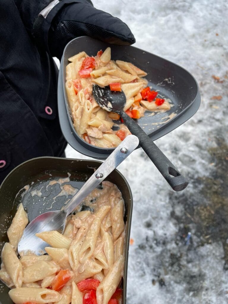 Kun vihdoin saimme telttapaikan tyhjäksi lumesta (ja jäästä), alkoi normaaliin tapaan teltan pystytys. Kun saimme teltan pystyyn meillä oli paljon vapaa-aikaa, joten leikimme mm. piitä, bussipysäkkipeliä ja kirkonrottaa. Kun vapaa-aika loppui, oli aika tehdä ruokaa. Ruoaksi meillä oli nuotionyyttejä. Nyytteihin tuli perunaa, sipulia, lihapullia sekä tuorejuustoa. Iltaohjelmassa lauloimme lauluja ja pelasimme bumtsibumia.